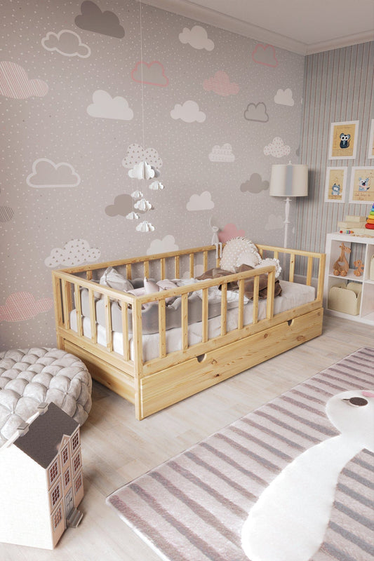 Çekmeceli Montessori Bebek ve Çocuk Karyolası Doğal Ahşap